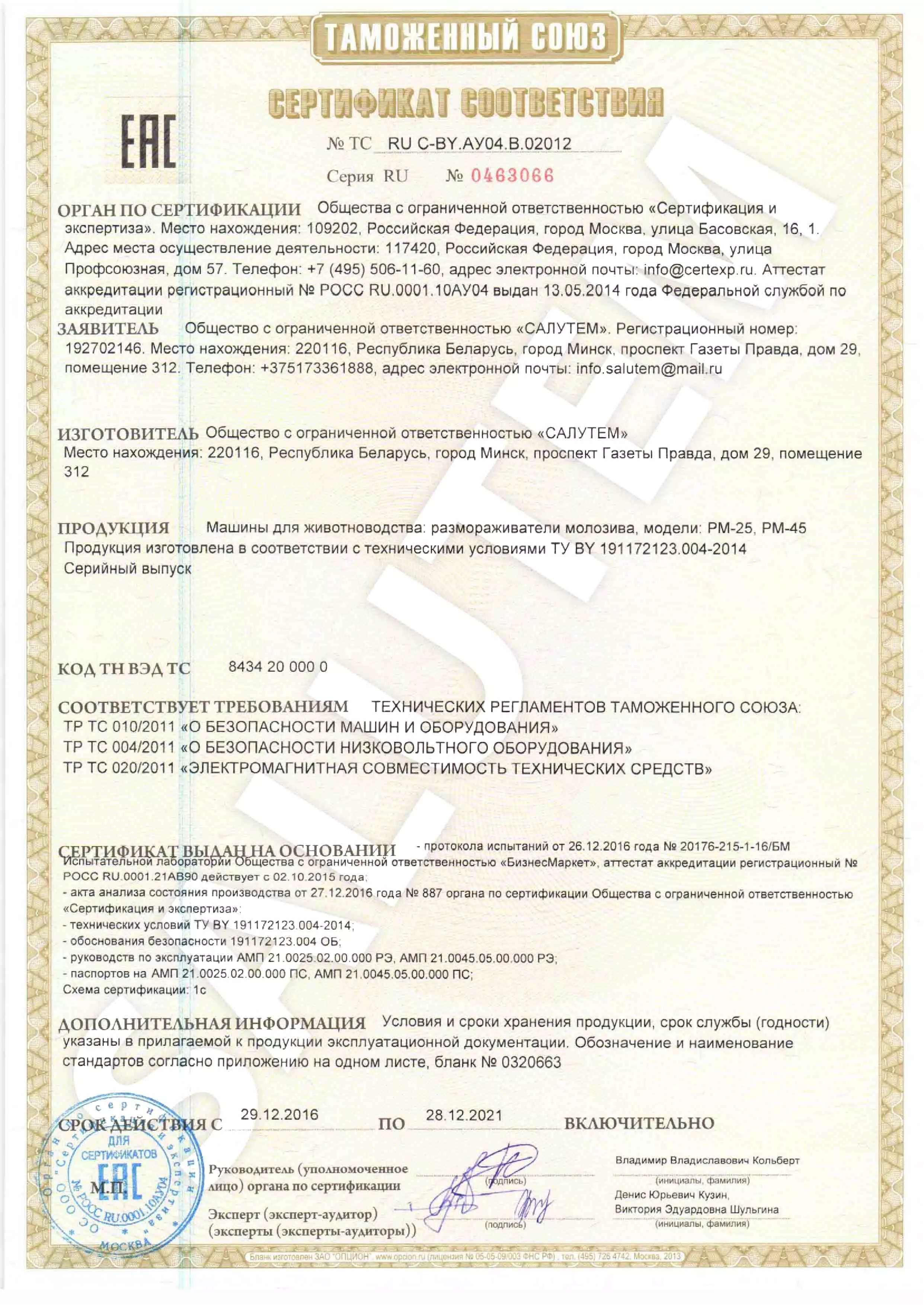 Сертификат соответствия продукции ТР ТС №ТС RU C - BY. АУ04.В.02012
